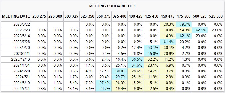 CME“美联储观察工具”,市场目前预计美联储将于3月份加息25个基点的可能性达到79.7%,暂停加息的可能性为20.3%。